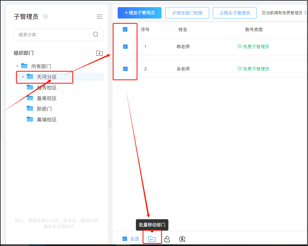 批量移动: 在子管理员列表中可选择多个或者全选子管理员,选择完毕后点击批量移动分类部门即可。