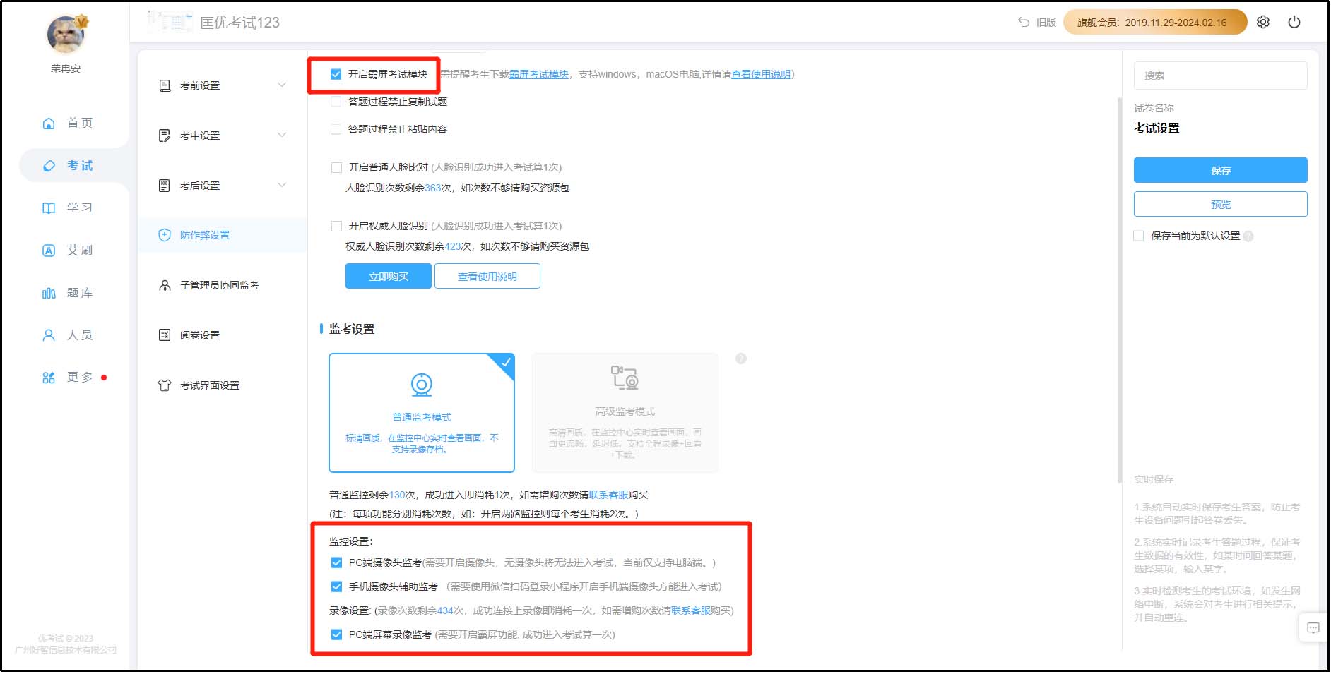2、点击【防作弊设置】,勾选“霸屏功能”、“PC端摄像头监考”、“手机摄像头辅助监考”、“PC端屏幕录像监考”,