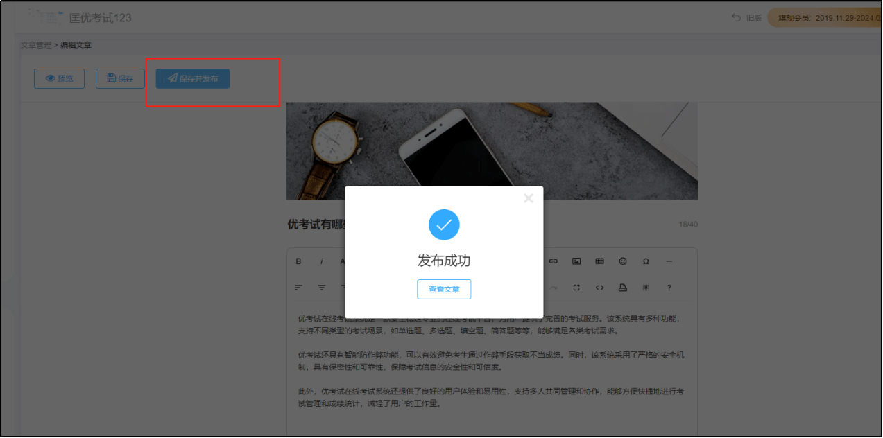 用户可以在主页的文章管理处添加文章,用于发布机构通知、活动内容、行业资讯以及推广文章等。
